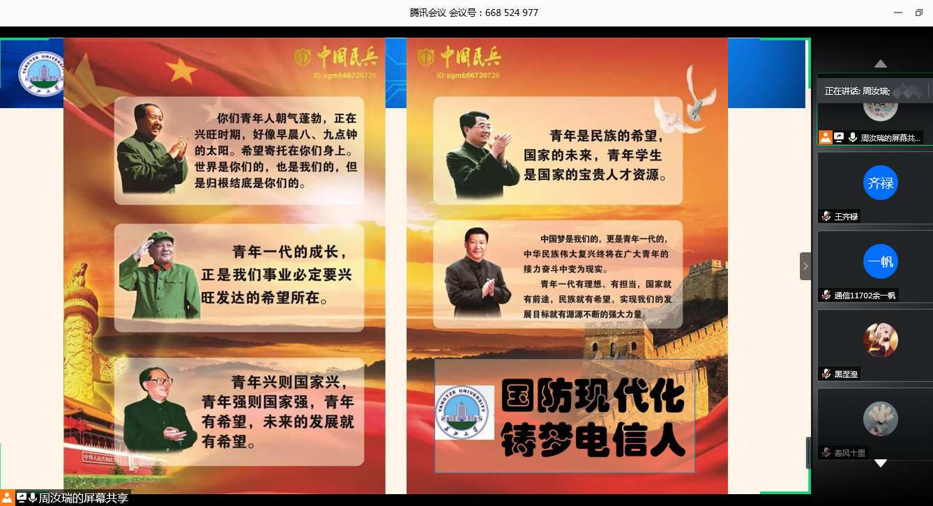 宣讲会上,周老师首先向同学们说明了2020年征兵工作由于疫情原因发生的一些政策及参军流程变化。接着,周老师主要从青年寄语、条件标准、应征指南、优待政策、成长进步五个方面阐述了今年的征兵政策。结合公司员工实际情况,周老师重点阐述了在校老员工参军入伍后在复学、考研、就业、公务员招考、士兵提干、学费及经济补偿等方面的优抚政策,以及电信人参军的十大好处,电信员工参军不仅仅是报效祖国,促进个人发展,更是充分结合自己的专业特长,在信息战、无人战中检验自己的专业技能,用自己的实际行动践行“训练强军、科技兴军”人生理想。