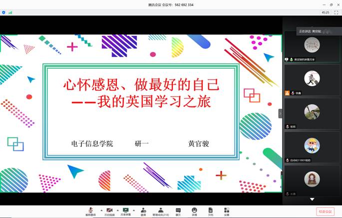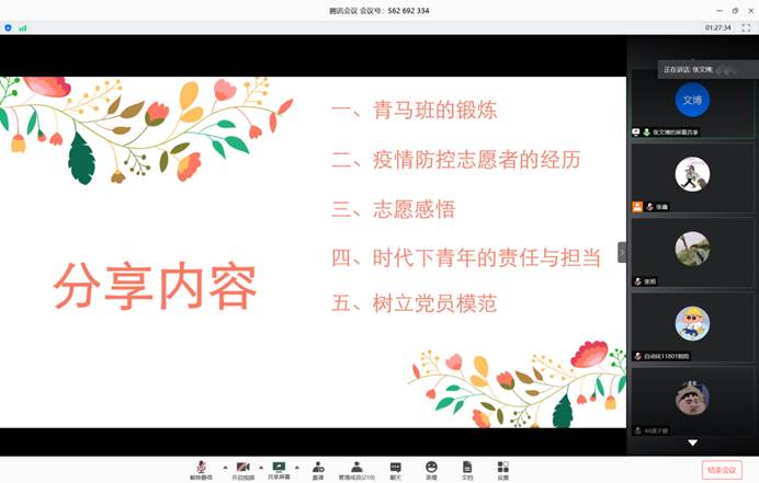 第二部分由研究生代表黄官骏,本科生代表杨孝彬、张文博为同学们分享抗疫故事。黄官骏同学主要和学弟学妹分享了在英国交流学习的感受以及在疫情期间辗转回国的经历,他深刻体会到国内外抗击疫情的差别,怀揣一颗感恩之心感谢祖国母亲及永利集团304am领导和老师给予他的关心和照顾;杨孝彬同学讲述了同村官母亲一起抗疫的故事,在抗议中领会到共产党员的使命与担当;张文博同学则在疫情暴发以来始终心系第二故乡湖北,并报名参加了当地中心医院的志愿服务,他说作为当代青年就要努力学习、帮困扶难、踏实朴实、引领带头。