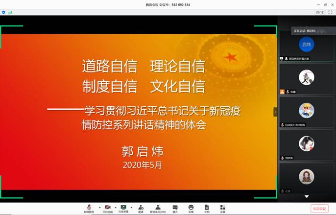 会议由辅导员张鑫主持,第一部分党委副书记郭启炜带领全体参会员工重温习近平总书记关于新冠疫情防控的重要论述和指示批示精神,用事例的方式讲解“四个自信”,再这次党课上他指出此次抗击疫情充分彰显了以人民为中心的发展思想,道路自信是历史的选择、人民的选择,理论自信推动实践发展 ,制度自信的关键在于中国共产党的领导和中国特色社会主义制度优势 ,文化自信事关国运兴衰、事关文化安全、事关民族精神独立性。