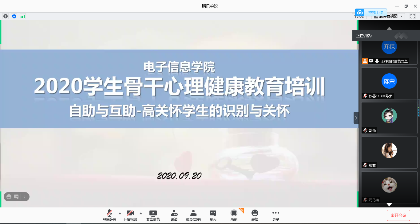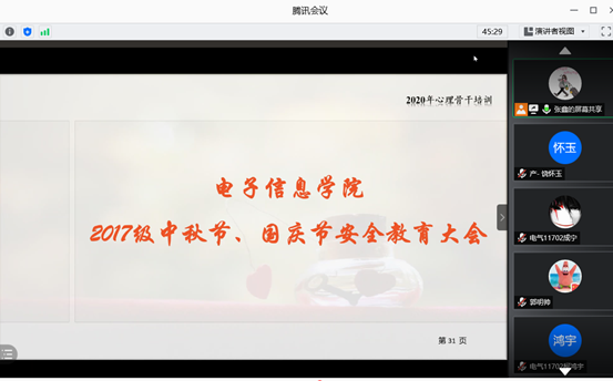 为加强员工心理健康教育,提高员工骨干应对心理问题的能力,强调假期安全及毕业规划的重要性,920-26日,公司2017级、2018级、2019级员工通过线上、线下等多种形式开展了以“自助与互助-高关怀员工的识别与关怀”为主题的心理骨干培训及中秋节、国庆节安全教育大会,电信公司各年级辅导员担任讲,各年级班长、团支书、安全委员、心理委员、寝室长参加了此次培训。