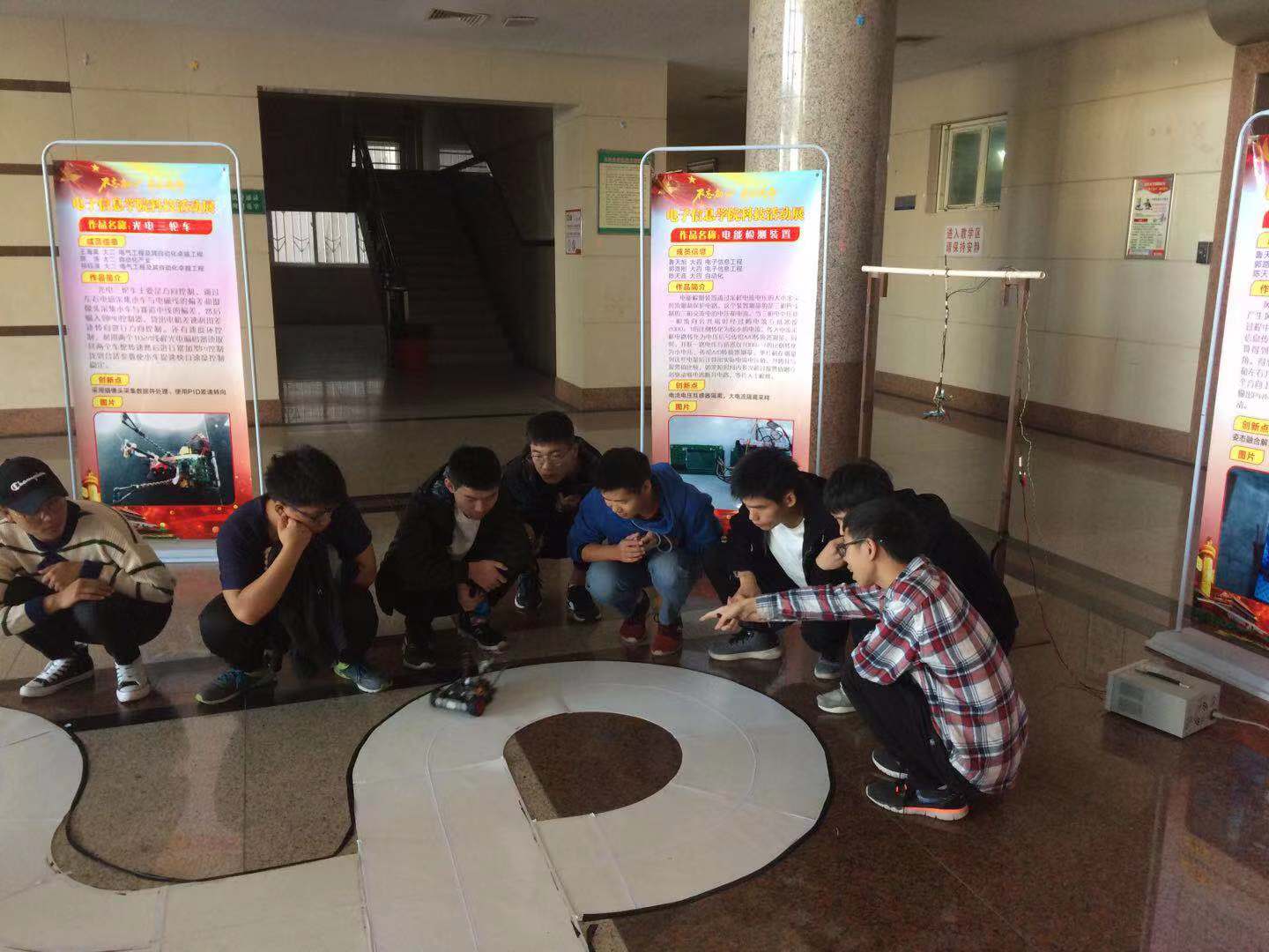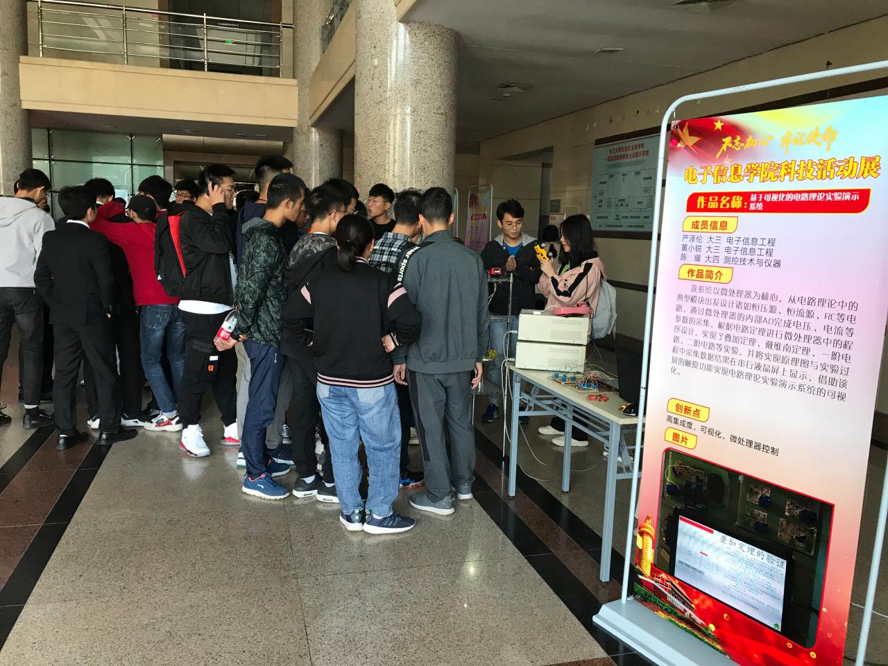 (通讯员 许友维) 10月19日上午9时,结合“不忘初心、牢记使命”主题教育,电子信息公司科技作品展在主教一楼大厅拉开帷幕,本次科技作品展的主题为“创新电信,智领未来”。电信公司党委书记刘逸,经理孙祥娥、副经理蔡昌新出席了本次活动。2019级新生在学长学姐们的引导下参观了此次科技作品展,同时走进实验室,听实验员老师介绍实验室仪器、设备,熟悉实验室用途,感受科技魅力。