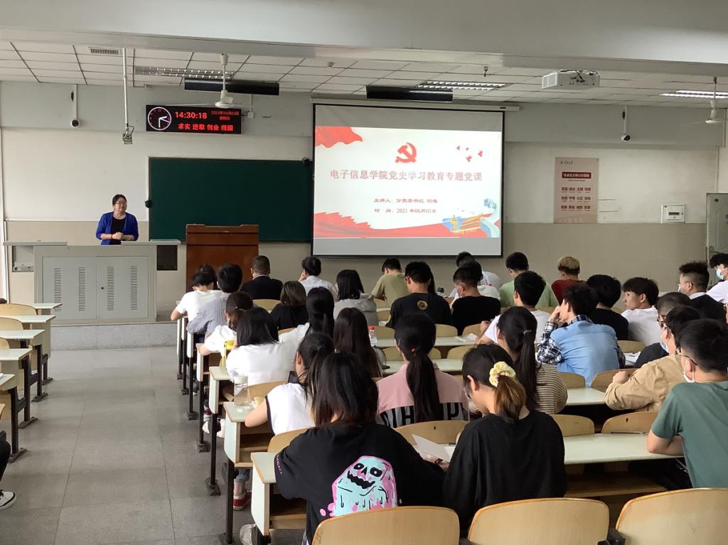 2021年6月3日,电子信息公司党史学习教育专题党课在12教102举行,本次党课由分党委书记刘逸主讲,由分党委副书记郭启炜主持,全体员工党员参加。