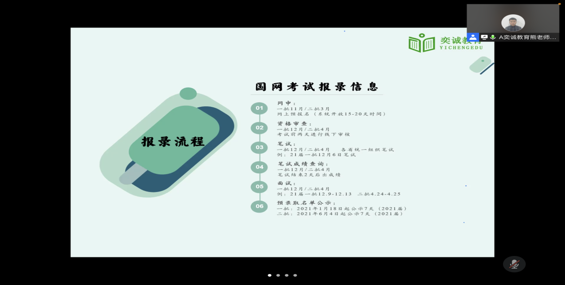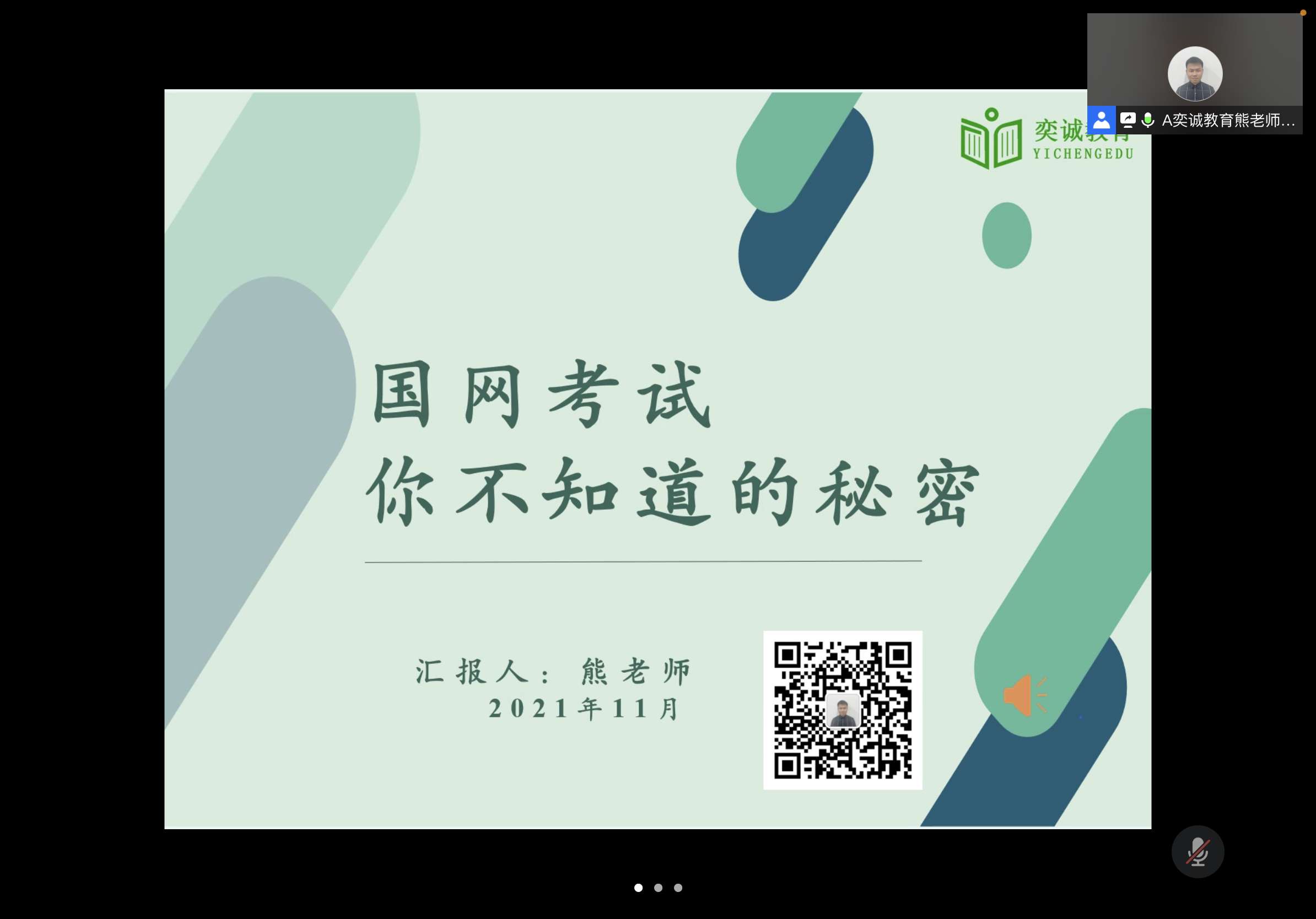 (通讯员 赵宇)为促进公司毕业生的就业和未来职业规划发展,为同学们提供专业的就业指导,公司于12月5日晚20:00通过线上腾讯会议的方式开展了“国网考试——你不知道的秘密”国家电网备考攻略主题讲座,本次讲座邀请了来自奕诚教育具有丰富的国考培训教育经验的熊军老师担任此次会议的主讲人,19级、20级电气专业员工参加此次主题讲座。