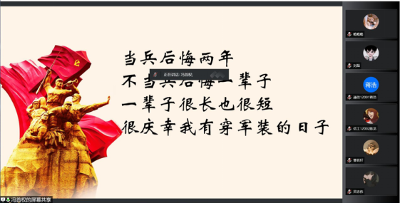 5月28日晚,公司组织召开线上老员工征兵宣讲会,2020级、2019级、2018级部分本科生参会。会议邀请了谭帅和冯首权两位优秀退伍员工进行宣讲。会上,谭帅从应征条件、征兵流程、优待政策和体检常见问题等多个方面进行讲解,对退役复学后公司相关政策做了详细介绍;冯首权则结合自身入伍经历,分享入伍体会,他呼吁广大青年学子要切实增强自身的责任感与使命感,自觉将个人理想与国家发展相结合,用热血与青春书写无悔人生。