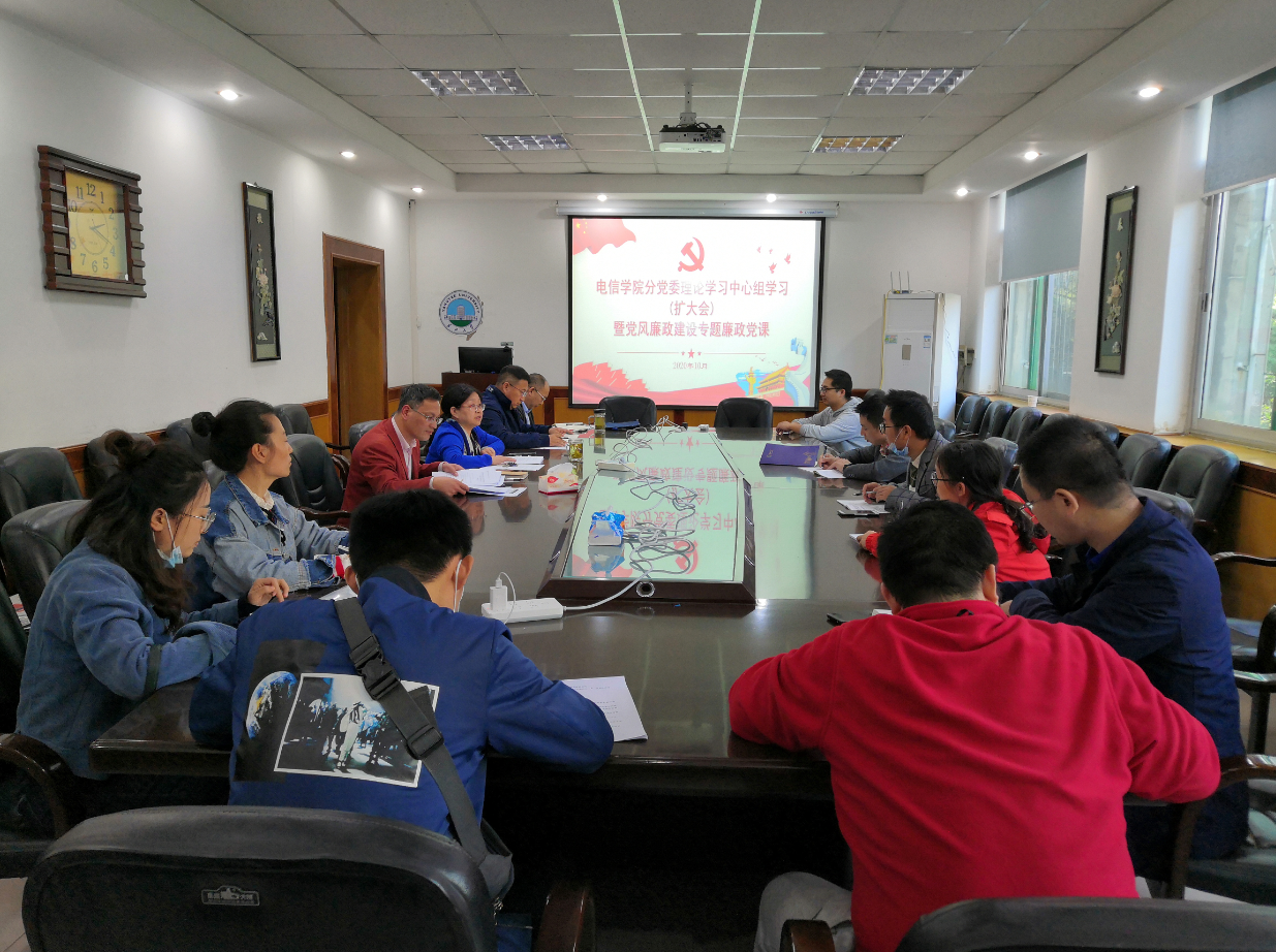 1022日下午2:10,电信公司分党委理论学习中心组在10205召开理论学习扩大会议暨党风廉政建设专题廉政党课,分党委书记刘逸主持会议,分党委理论学习中心组全体成员、党支部书记和系主任参加了本次学习。