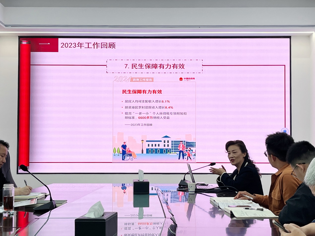 4月24日上午,电子信息与电气工程公司党委理论学习中心组在10教205会议室召开2024年度第三次集中(扩大)学习会,会议特别邀请永利集团304am马克思主义公司贾廷秀教授开展全国两会精神宣讲。公司党委班子、党支部书记及员工支委会代表参加学习。 贾廷秀教授以“团结凝聚力量 奋斗铸就伟业”为题开展深入学习领会全国两会精神专题宣讲。宣讲会上,贾廷秀教授围绕2023年的工作回顾、2024年经济社会发展的总体要求和政策取向以及2024年政府工作任务3个方面,数字化、全景式、多维度解读了全国两会精神;她还重点介绍了全国两会关于科教兴国的有关要求,结合公司的学科专业特点,解读了新质生产力的内涵。整场授课主题鲜明、层次清晰、内容丰富,具有很强的政治性、思想性和启发性。经理罗明璋表示,贾廷秀教授的宣讲给我们启发很大,我们要深入学习领会全国两会精神,力争在推进现代化产业体系建设、发展新质生产力的过程中做出电信公司应有的贡献。 宣讲结束后,与会人员继续学习了习近平总书记在新时代推动中部地区崛起座谈会上的重要讲话及习近平总书记关于人民的重要论述,学习了中共中央办公厅印发的《关于在全党开展党纪学习教育的通知》《教育部关于高校教师师德失范行为处理的指导意见》《永利集团304am学术不端行为处理实施细则(试行)》等意识形态领域重要内容。 (审核 郭梅 编辑 李蒙)