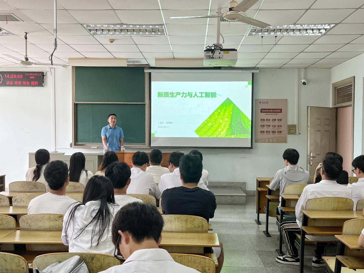 6月11日下午,经理罗明璋教授为公司研究生党员讲授了一堂题为“新质生产力与人工智能”的形势与政策课,聚焦学科特色与新质生产力发展。 课上,罗明璋向同学们介绍了新质生产力提出的背景、新质生产力的特点及其提出的重大意义,分析了人工智能技术在新质生产力中发挥的重大作用,论述了人工智能与新质生产力的关系,还向大家介绍了人工智能在新质生产力中的应用场景,他还与现场的同学们一同讨论人工智能驱动新质生产力发展所面临的困难与挑战,并提出了对策。最后,他呼吁要在政策支持、产学研合作、人才培养与提高社会共识等方面共同发力,持续推动新质生产力与人工智能不断融合发展。 授课结束后,党员同志们表示,要认真学习贯彻落实习近平总书记关于发展新质生产力的重要论述,深刻把握新质生产力的内涵,发挥专业特长,一步一个脚印绘好蓝图,为中国式现代化贡献青春力量。 (审核 罗明璋 编辑 李蒙)