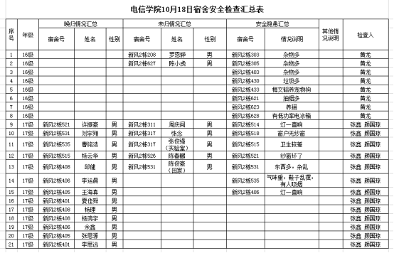 为了确保员工宿舍安全,营造良好的宿舍环境,2019年10月18日晚,电信公司分党委书记刘逸带领全体辅导员深入宿舍宿舍检查员工晚归、未归并进行安全隐患排查和提醒。