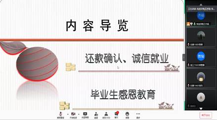 2020年6月13日,为确认员工联系方式等贷后管理工作,同时加强毕业年级员工的诚信就业教育,电子信息公司2020年还款确认、诚信就业主题教育班会以腾讯会议的形式在线上举行。电信公司2018级辅导员王齐禄老师、2016级辅导员艾林老师、2016级全体同学参加了此次主题班会。