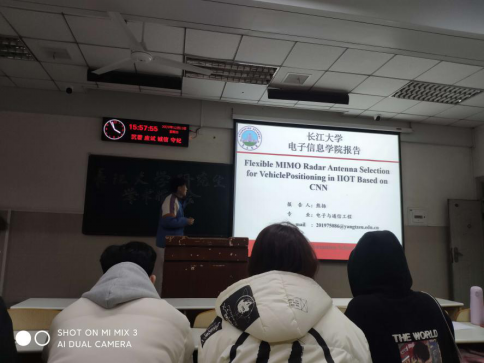 会上熊扬就自己的研究方向和同学们进行交流,并向大家作题为“Flexible MIMOReader Antenna Selection for Vehicle Positioning in IIOT Based on CNN”的论文报告。报告中熊扬同学围绕MIMO雷达的车载定位背景以及工业大数据和深度学习等三个方面进行报告,核心思想是通过传统算法删选出最佳的Tx/Rx对,来得到协方差矩阵;通过三种深度学习算法对协方差矩阵进行训练和测试,并得到最终预测精度和混淆矩阵。熊扬同学的报告让同学们对于我国雷达行业背景以及国内外现状有了基本的了解,也对电子信息专业知识有了更多的兴趣,同学们受益匪浅。