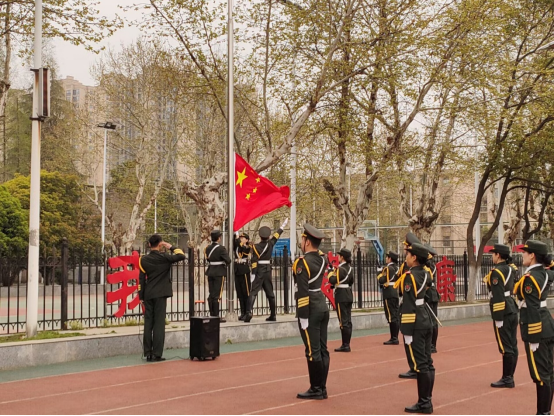 升旗仪式进入尾声,全体师生踏着朝阳晨曦奔赴新一天的征程。