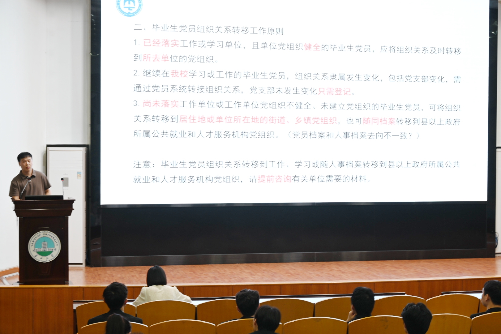 6月7日晚,公司党委组织召开毕业生党员教育大会。会上辅导员万谦带领全体党员重温了入党誓词,党委副书记张晨露讲授了党纪学习教育专题党课,要求党员同志们严明党的纪律规矩,展现新时代党员风貌;党建秘书李蒙对毕业生党员党组织关系转接作了强调。会上对毕业生党员们提出了殷切期望,寄语毕业生党员不忘初心,牢记使命,发扬长大精神,在更大的舞台上展现长大学子的风采。