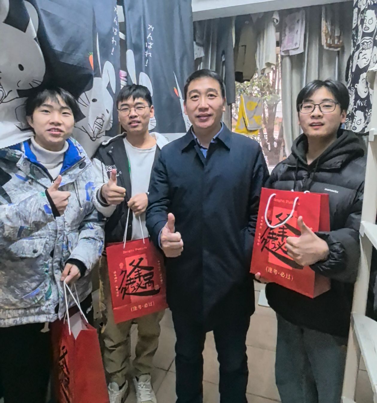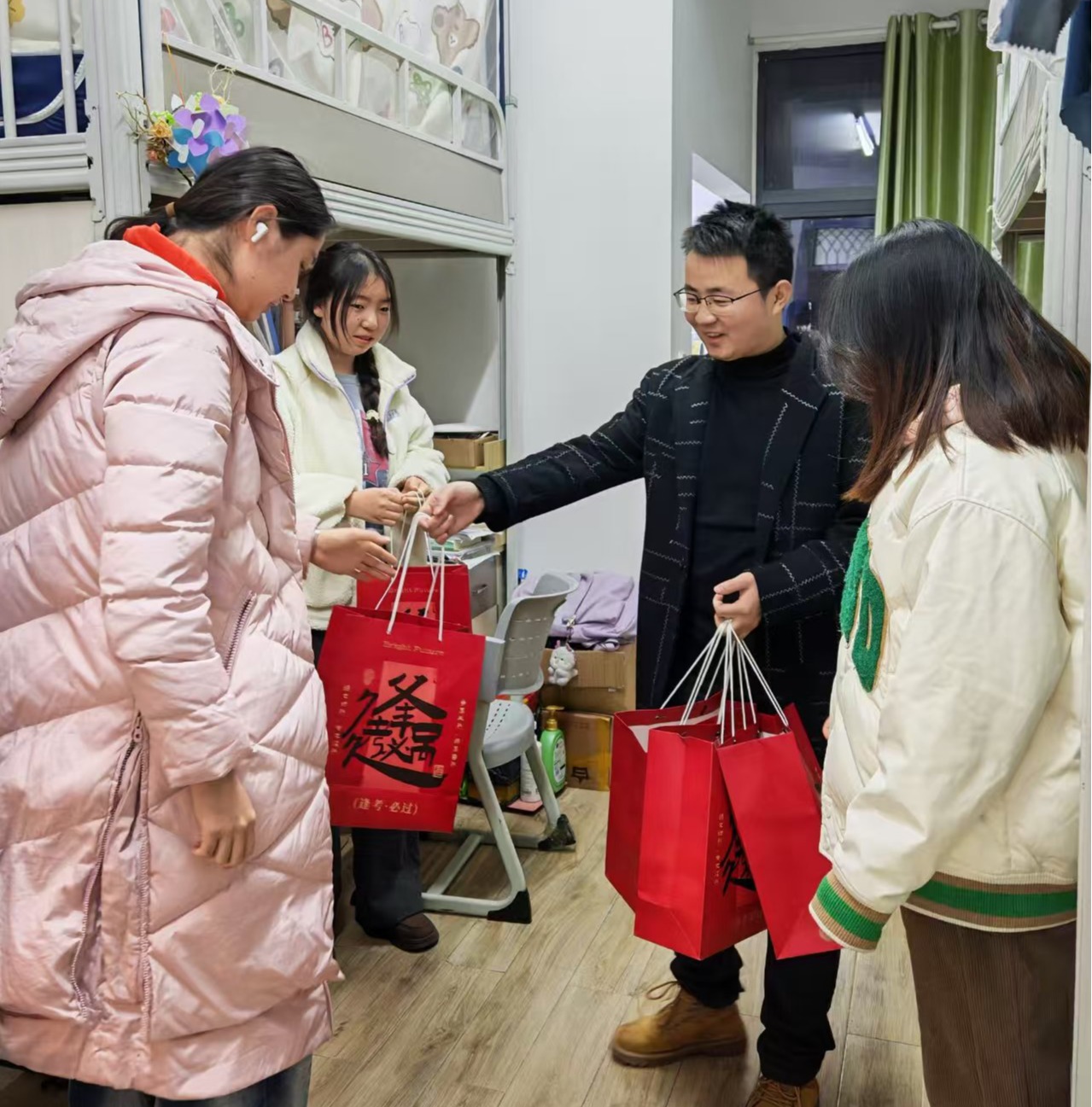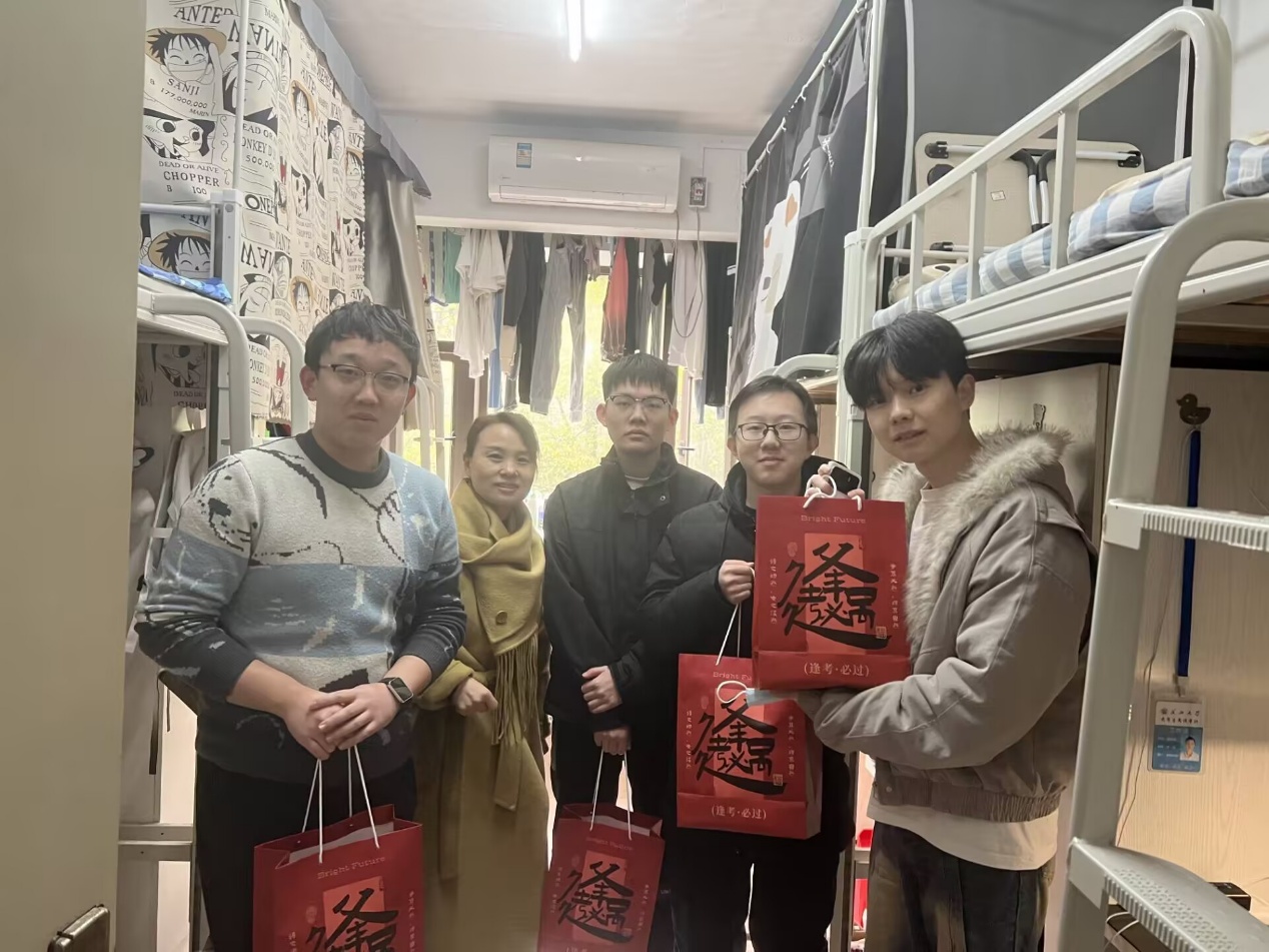 12月16日至17日,公司领导、年级辅导员和班主任走访考研员工寝室带着满满的关怀与祝福,将这份充满爱与祝福的“考研大礼包”亲手送到每一位考研学子的手中。