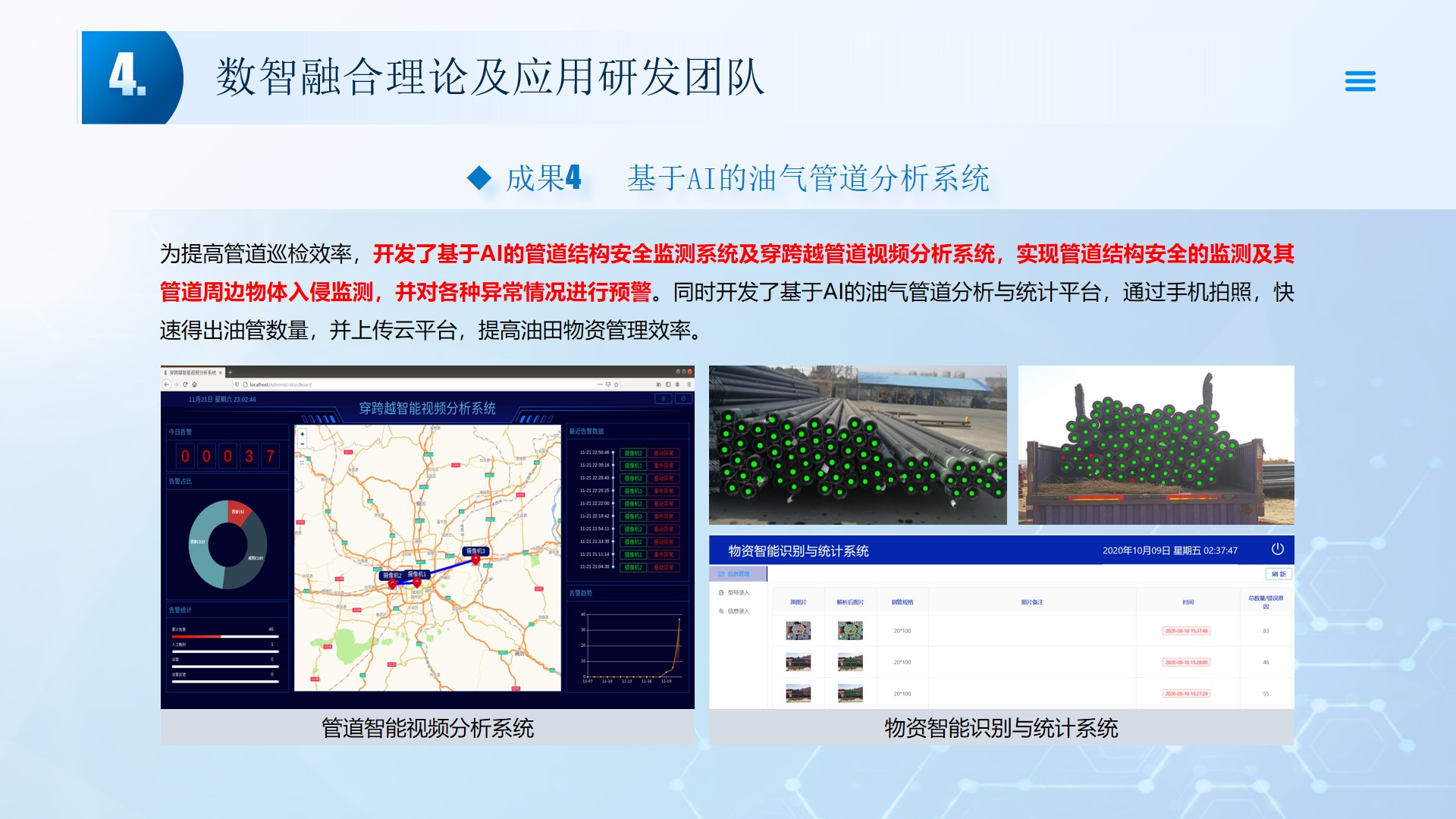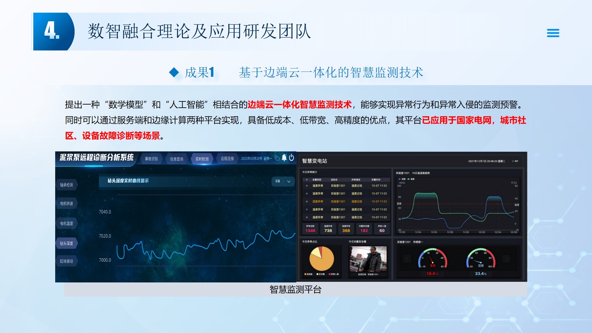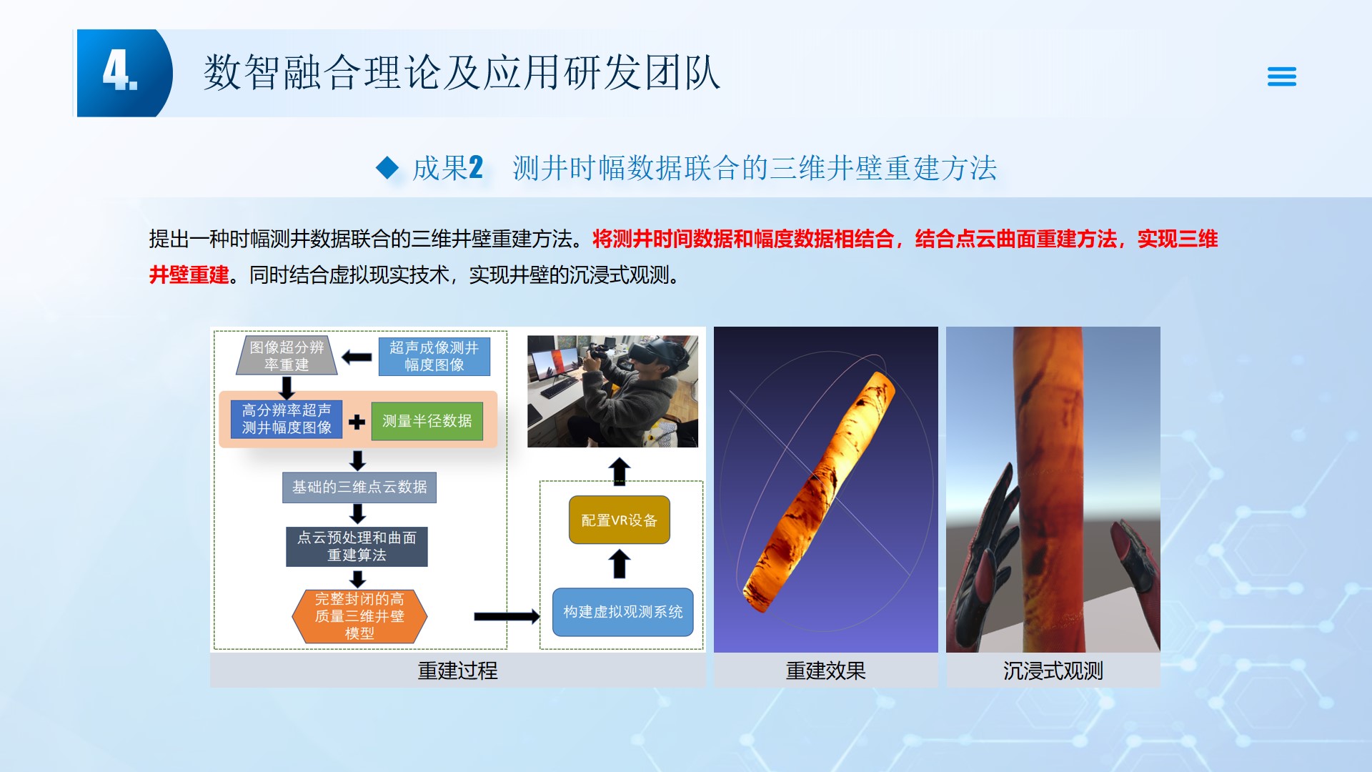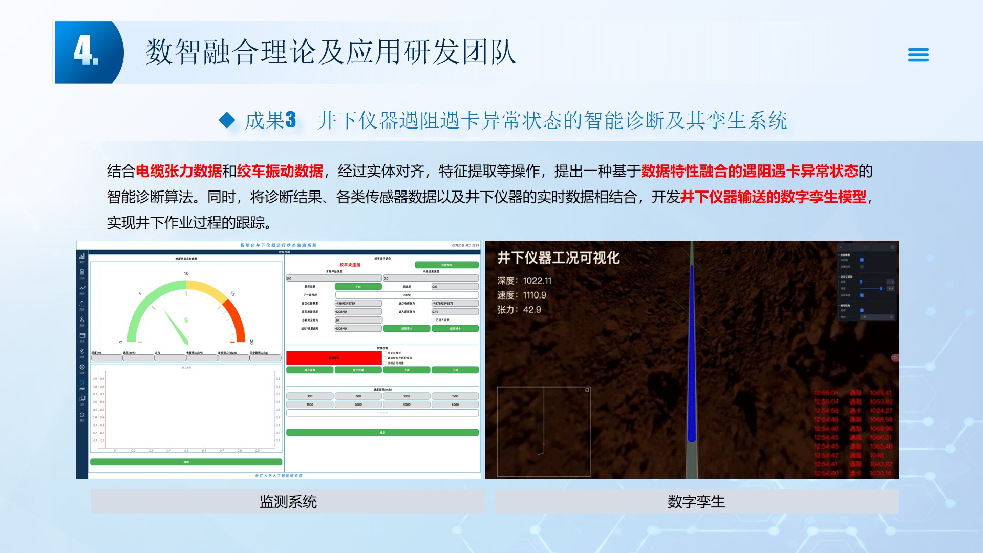 团队围绕数智融合理论及应用开展了多项研究工作,团队成员主持国家自然科学基金3项、湖北省自然科学基金2项、中石油创新基金及横向课题30余项。在《Smart Materials and Structures》、《Remote sensing》、《IEEE Internet of Things Journal》、《IET Image Processing》等国内外权威学术期刊发表论文100多篇,出版专著2部,授权专利20余项;获湖北省科技进步三等奖2项。团队承担了人工智能、图像处理、信号处理、数据挖掘、大数据分析和三维建模,涉及的领域包括智慧油田、智慧农业、智慧交通、智慧医疗和智慧金融等领域。智慧油田方面开展的工作主要包括:中深部储层预测技术、井震联合的三维地质建模技术、智能化井场实时监控技术、智能化随钻地质导向技术和智能化地层压力预测技术等。部分成果已在油田现场、电力系统、农业场景、城市社区和医疗系统等方面取得了良好的应用效果。