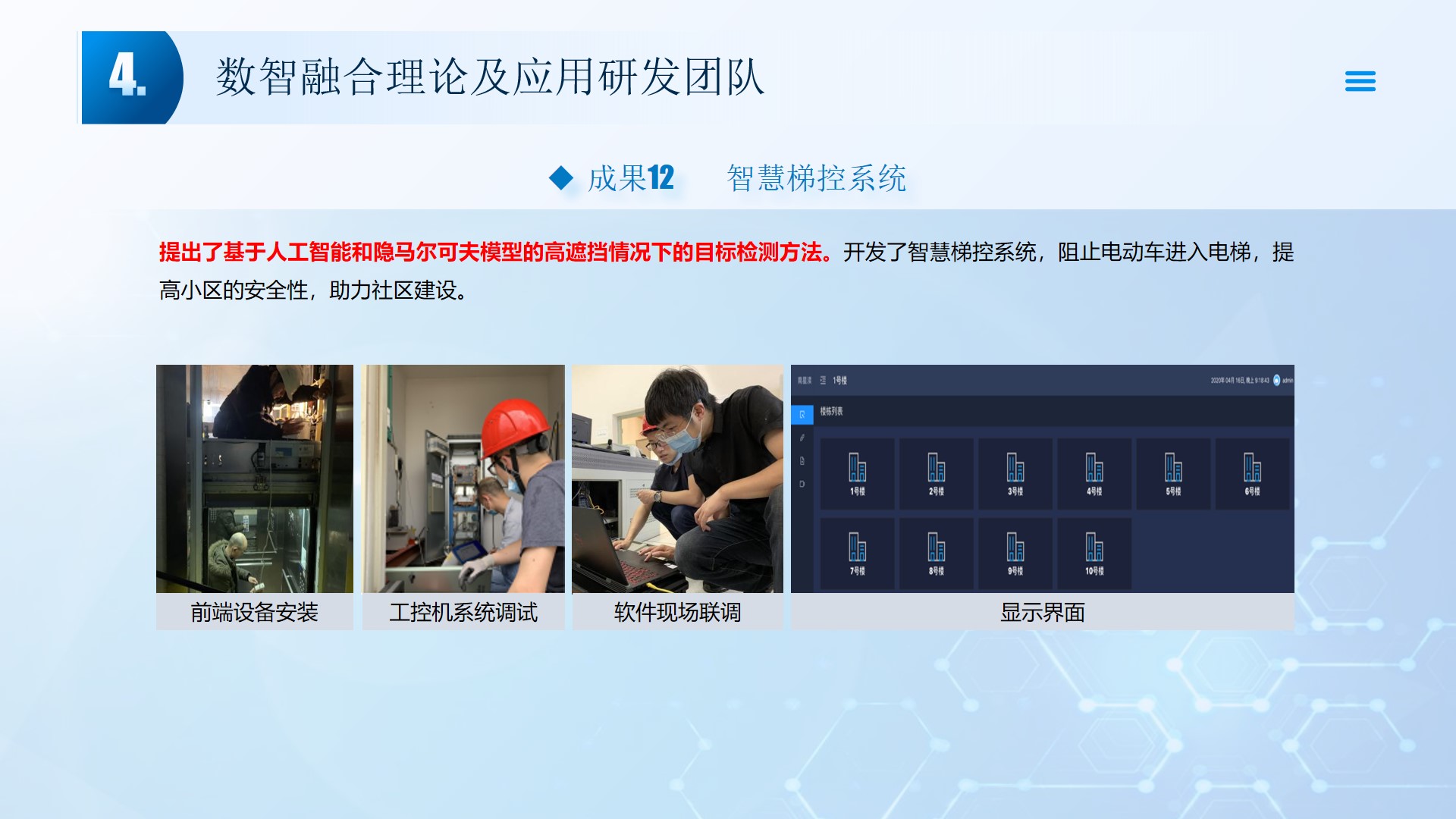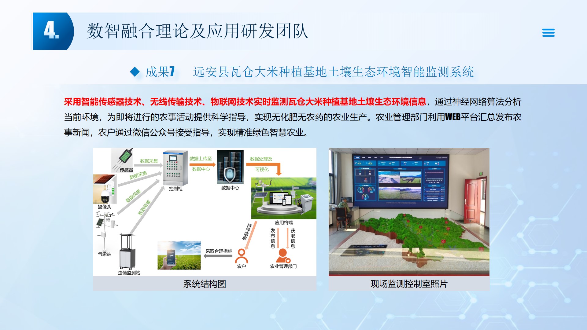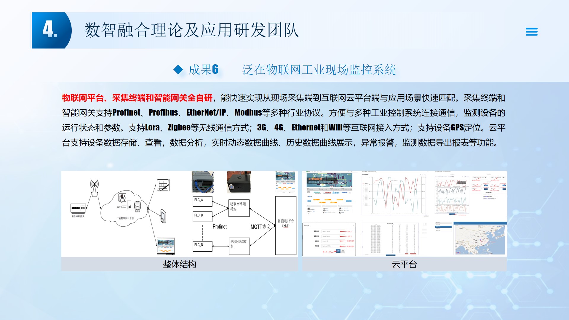 团队围绕数智融合理论及应用开展了多项研究工作,团队成员主持国家自然科学基金3项、湖北省自然科学基金2项、中石油创新基金及横向课题30余项。在《Smart Materials and Structures》、《Remote sensing》、《IEEE Internet of Things Journal》、《IET Image Processing》等国内外权威学术期刊发表论文100多篇,出版专著2部,授权专利20余项;获湖北省科技进步三等奖2项。团队承担了人工智能、图像处理、信号处理、数据挖掘、大数据分析和三维建模,涉及的领域包括智慧油田、智慧农业、智慧交通、智慧医疗和智慧金融等领域。智慧油田方面开展的工作主要包括:中深部储层预测技术、井震联合的三维地质建模技术、智能化井场实时监控技术、智能化随钻地质导向技术和智能化地层压力预测技术等。部分成果已在油田现场、电力系统、农业场景、城市社区和医疗系统等方面取得了良好的应用效果。
