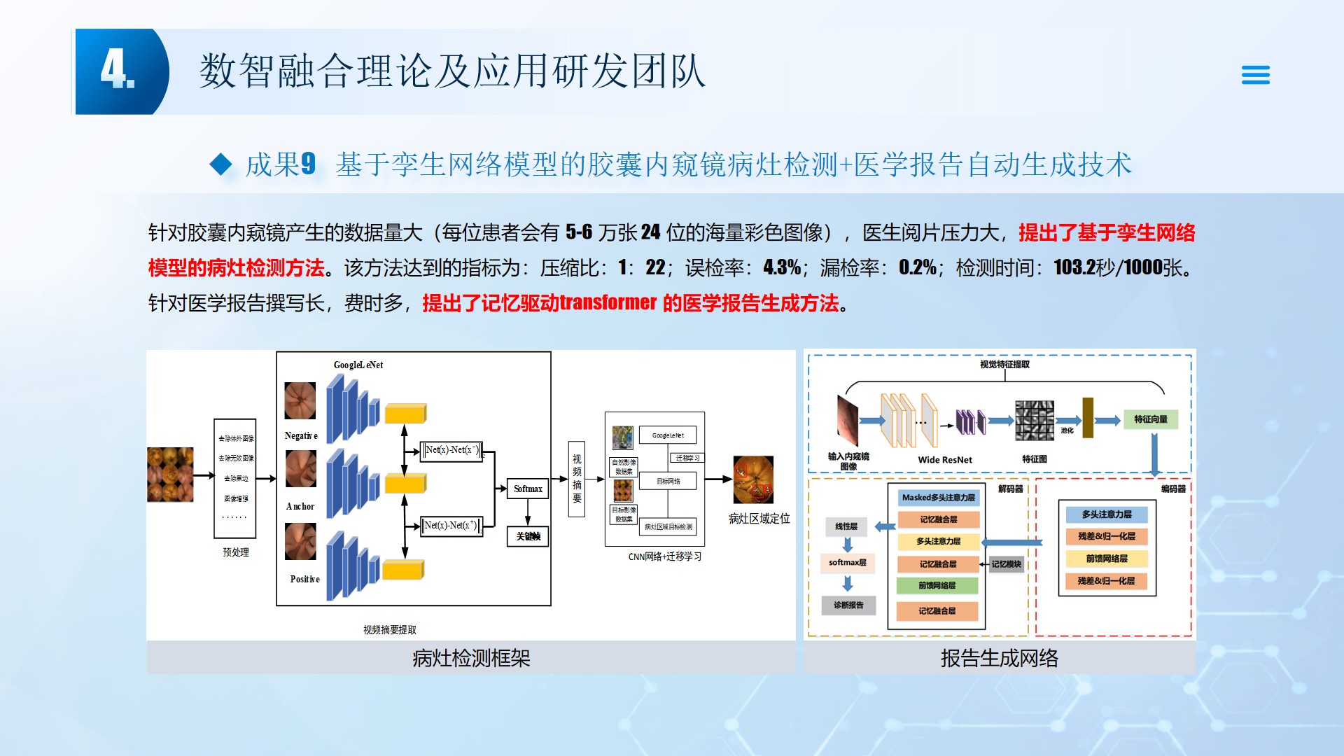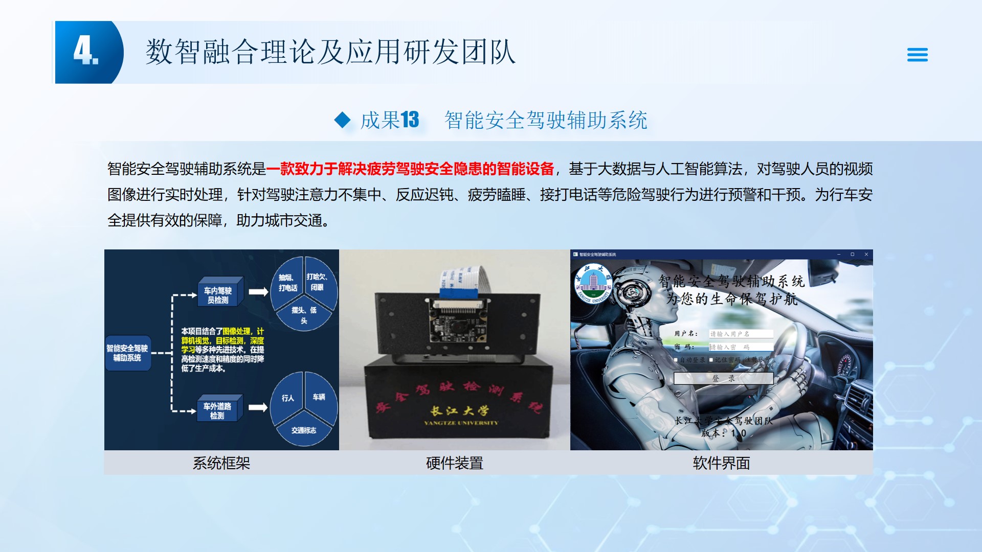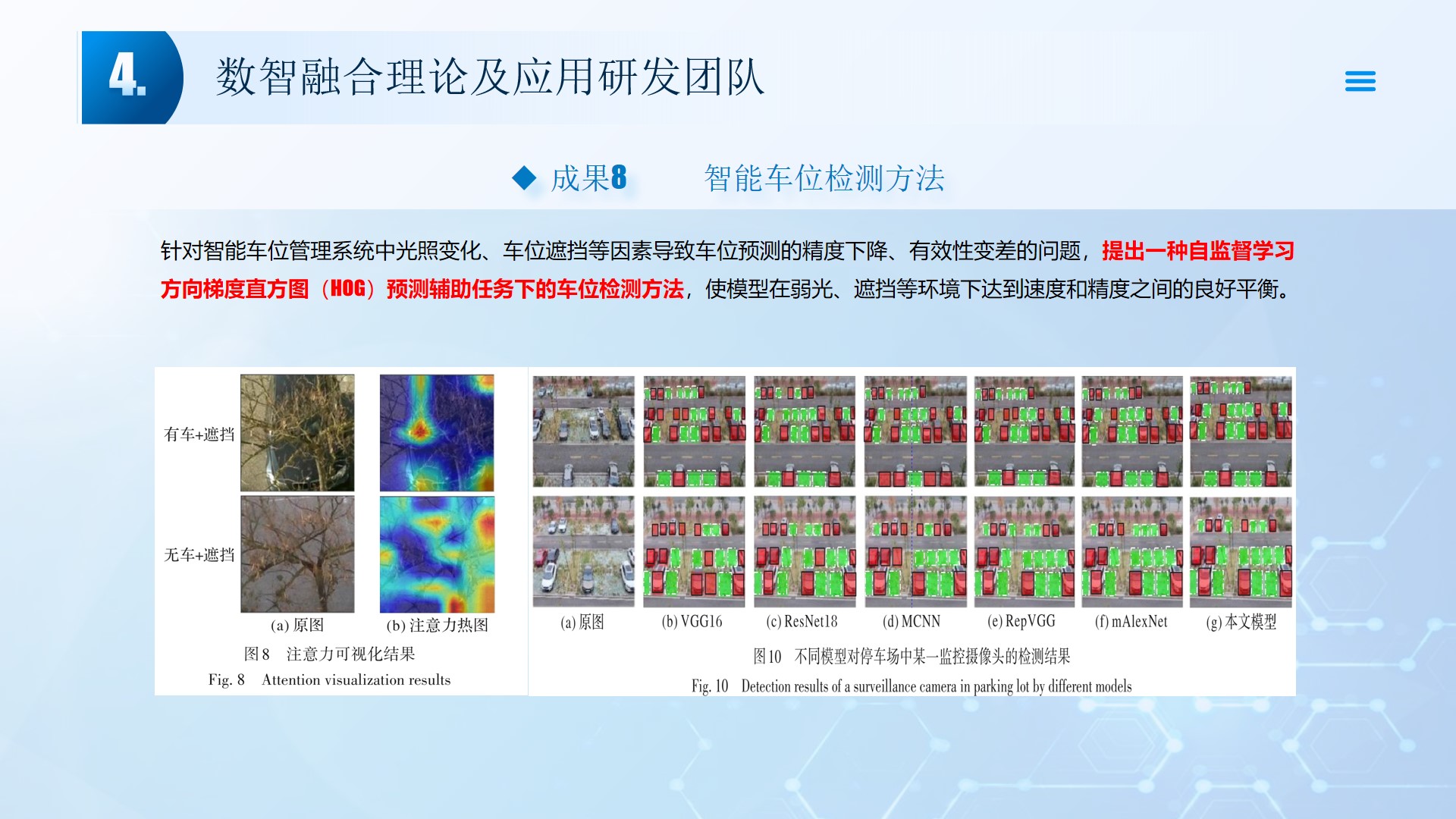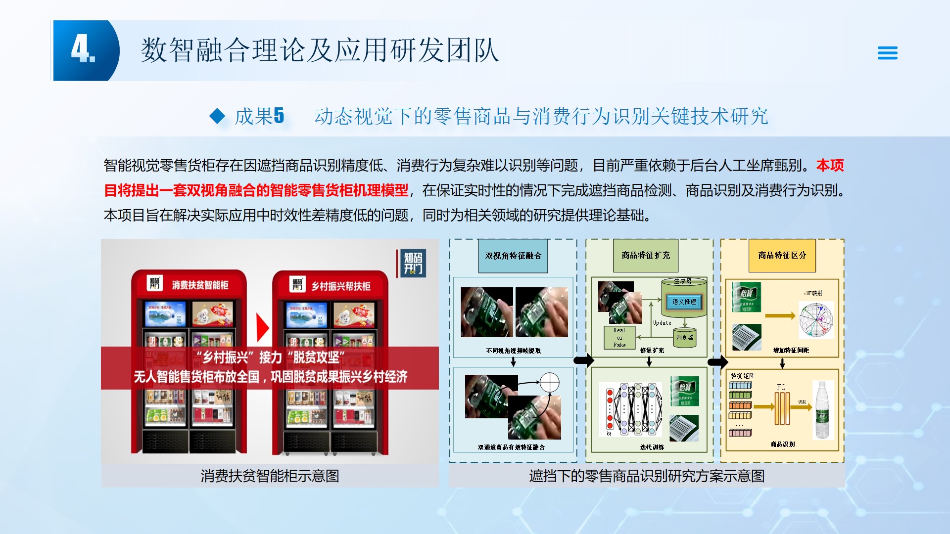 团队围绕数智融合理论及应用开展了多项研究工作,团队成员主持国家自然科学基金3项、湖北省自然科学基金2项、中石油创新基金及横向课题30余项。在《Smart Materials and Structures》、《Remote sensing》、《IEEE Internet of Things Journal》、《IET Image Processing》等国内外权威学术期刊发表论文100多篇,出版专著2部,授权专利20余项;获湖北省科技进步三等奖2项。团队承担了人工智能、图像处理、信号处理、数据挖掘、大数据分析和三维建模,涉及的领域包括智慧油田、智慧农业、智慧交通、智慧医疗和智慧金融等领域。智慧油田方面开展的工作主要包括:中深部储层预测技术、井震联合的三维地质建模技术、智能化井场实时监控技术、智能化随钻地质导向技术和智能化地层压力预测技术等。部分成果已在油田现场、电力系统、农业场景、城市社区和医疗系统等方面取得了良好的应用效果。